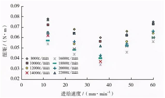 進行鋁合金微小孔鉆削試驗,在12mm/min、24mm/min、36mm/min、48mm/min 和60mm/min 的不同進給速度下考察主軸轉(zhuǎn)速對鉆削軸向力和扭矩的影響。主軸轉(zhuǎn)速為8000~22000r/min